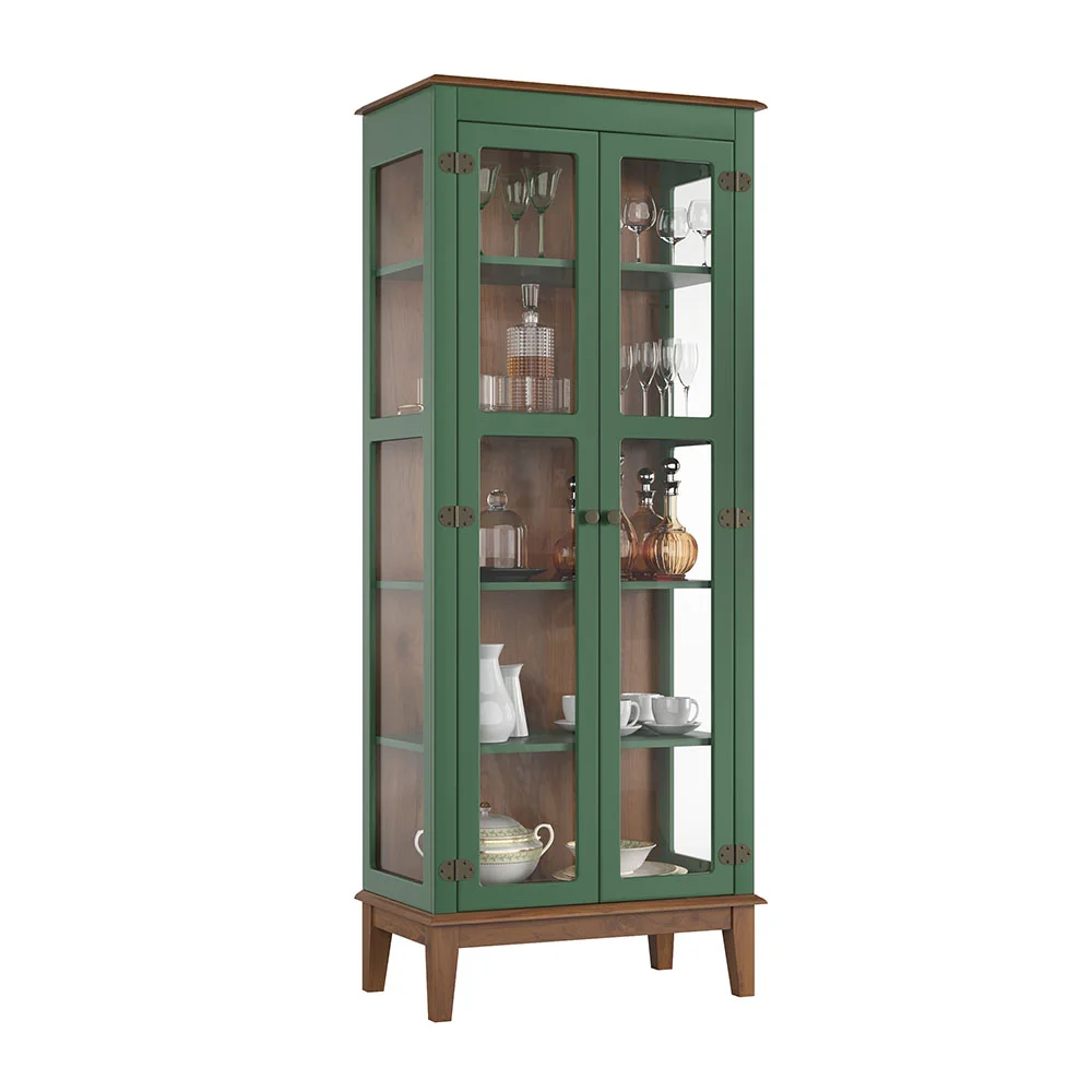 Com estrutura em madeira maciça Taeda (pés e tampo superior) e corpo em MDF 18mm, essa cristaleira une robustez e consciência ambiental. O acabamento em laca verde acetinada garante suavidade ao toque, brilho leve e proteção contra desgastes.